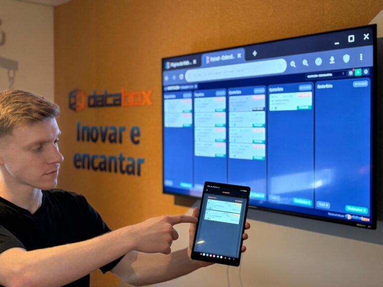 Essas informações são automaticamente integradas ao sistema da Databox, alimentando relatórios e o Painel Produtivo, que mostra o andamento da produção em tempo real.